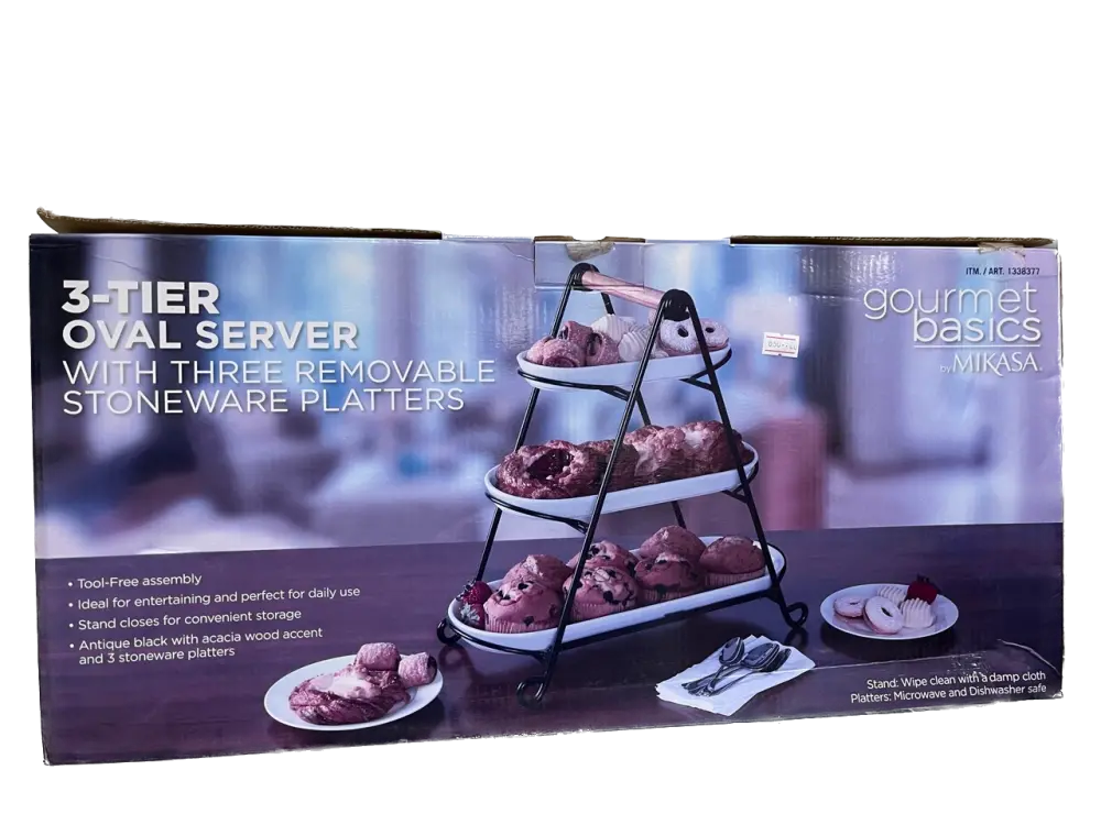 3-Tier Oval Server: The server features a handcrafted carbon steel frame with an Acacia wood carrying handle. The stoneware platters are microwave and dishwasher safe, while the stand should be wiped clean with a damp cloth.