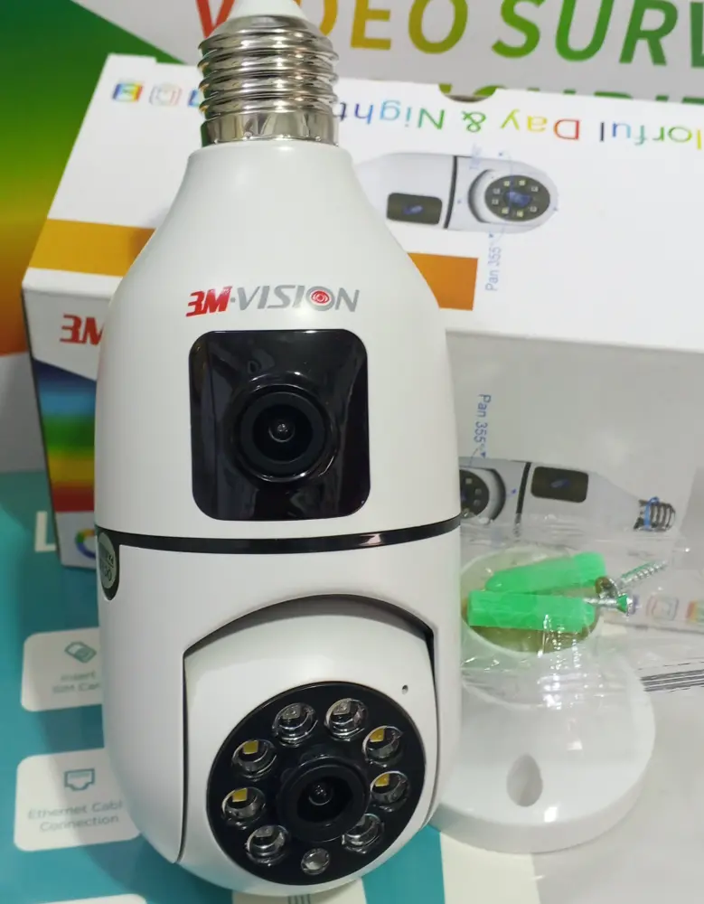 Package Contents: Usually includes the dual-lens camera, an E27 socket adapter, and an instruction manual.