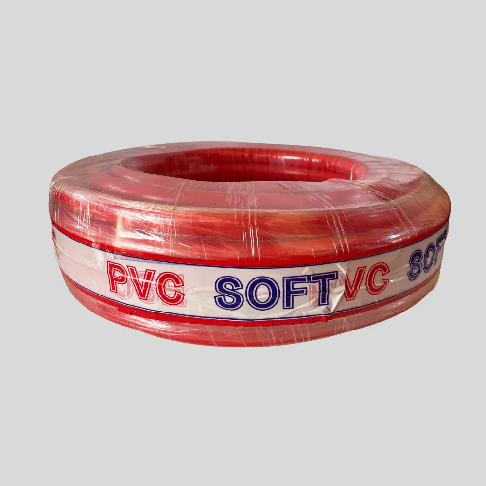 This item is a red PVC soft hose, which is a type of reinforced flexible hose used for transferring water, air, and various chemicals across a wide range of applications.