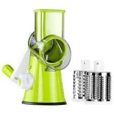Designed for quickly slicing, shredding, and grinding vegetables, nuts, and cheese. It typically features a suction base for stability during use and comes with three interchangeable stainless steel drum blades for different cutting styles.