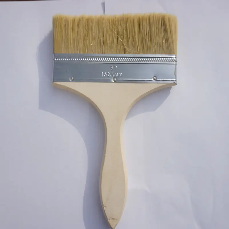 This appears to be a wide, flat paintbrush with natural bristles and a wooden handle, identified as 150mm wide, a common size for covering large surface areas. The natural animal hair bristles are often used for applying oil-based paints, varnishes, and stains to achieve a smooth finish.
