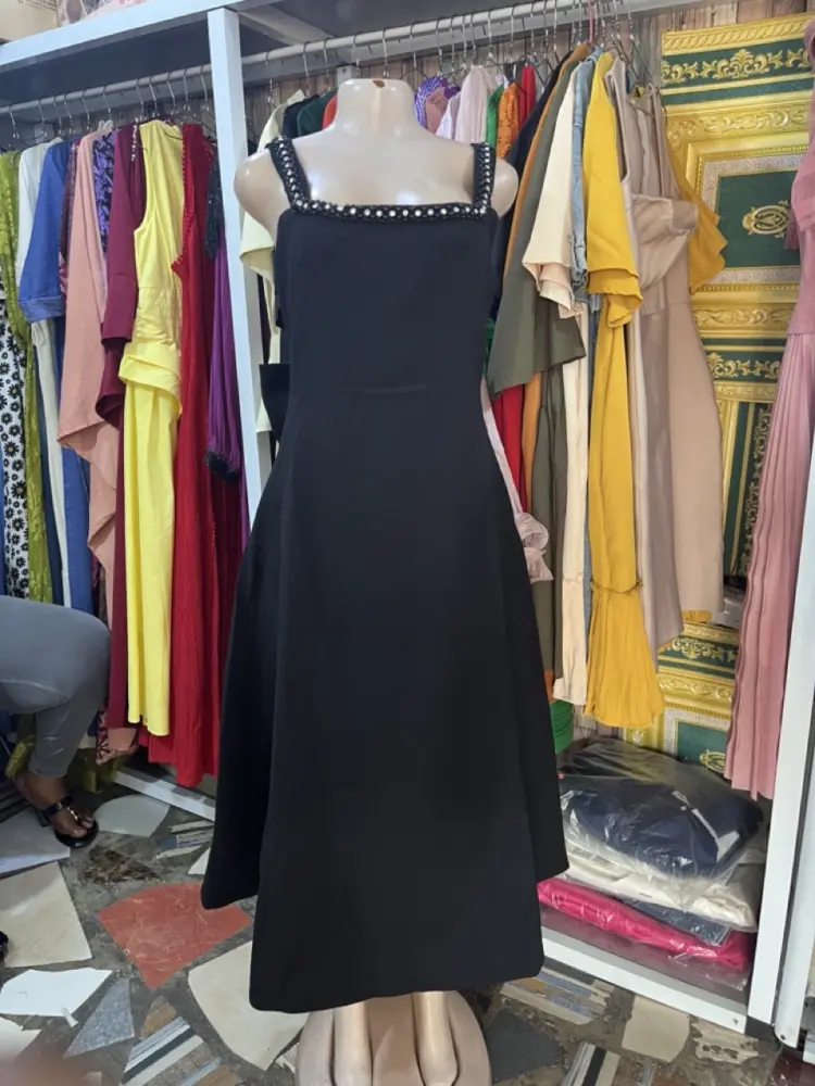 Fabric: Based on its structured drape, the dress likely consists of a medium-weight fabric like cotton poplin, shantung silk, or a poly-blend crepe that holds the shape of the flare and the bow.