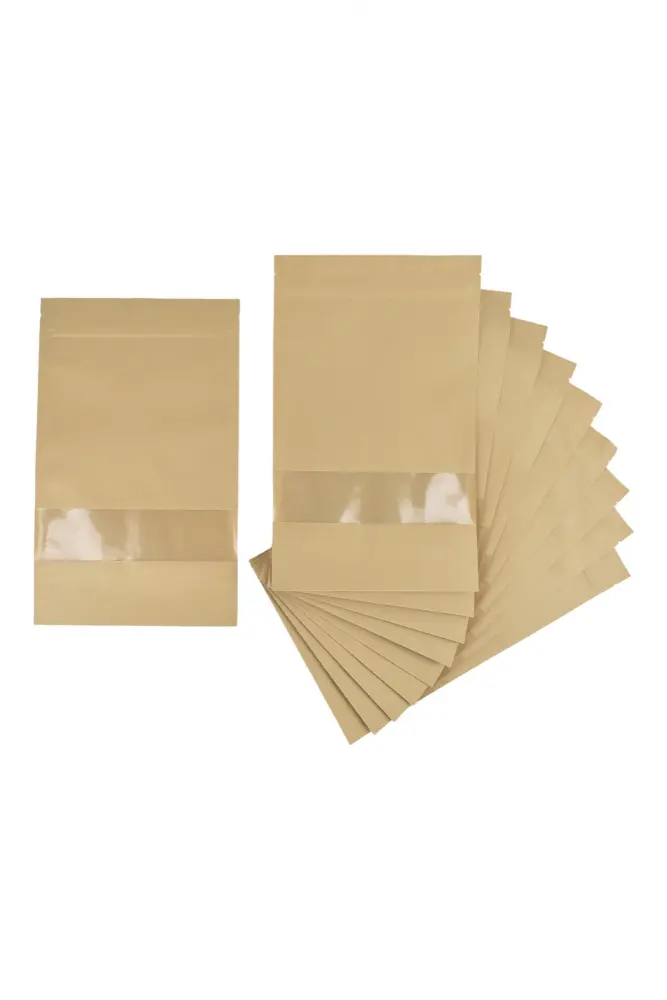 Kraft paper stand-up pouches (also known as Doypacks) with a resealable zip lock and a transparent window. They are primarily used for packaging food and non-food items due to their functional design and natural, eco-friendly appearance.