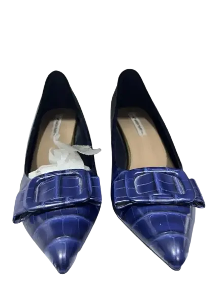 Embellishment: A prominent, oversized square buckle sits across the vamp (the upper part of the shoe). The buckle appears to be covered in the same blue mock-croc material, creating a seamless, monochromatic aesthetic.