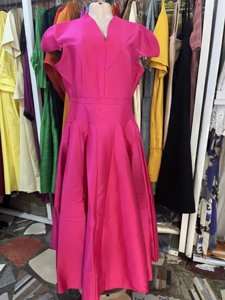 Bodice: Features a V-neckline and short cap sleeves. The tailored bodice typically includes figure-defining seams that transition into sharp, volume-adding pleats at the waist.