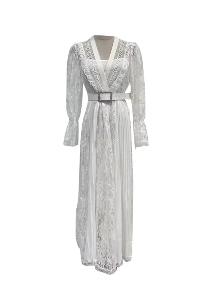 Design: The dress typically includes a V-neckline, hollow-out lace or guipure embroidery, and long sleeves. Some variations feature a crystal buckle belt.