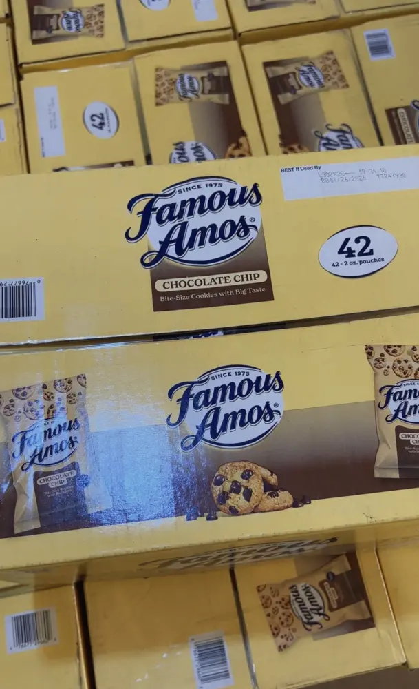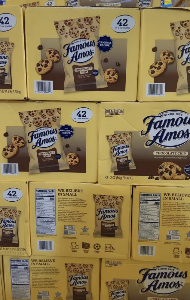 Famous Amos Chocolate Chip Cookies are a popular brand of bite-sized cookies known for their rich homemade taste, made with premium semi-sweet chocolate chips and a signature recipe that started in 1075. They are famous for their small, crunchy texture making them ideal for snacking.