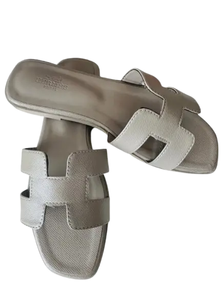 Hermès Oran Sandal, a signature flat silhouette known for its iconic "H" cut-out strap. Based on the light, neutral tone, the color appears to be Beige Mastic or a similar grey-beige shade like Gris Etain or Etoupe