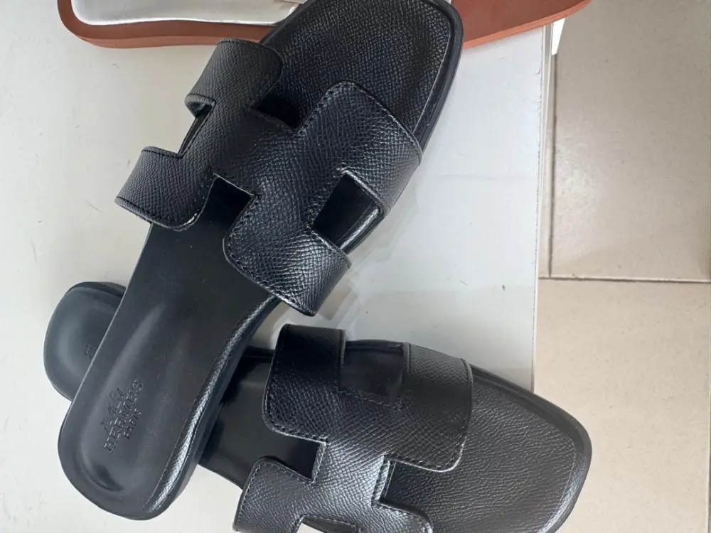 iconic Hermès Oran sandals in black leather. Known for their minimalist sophistication, these flat sandals feature a distinctive "H" cut-out strap, which is a signature element of the Hermès brand
