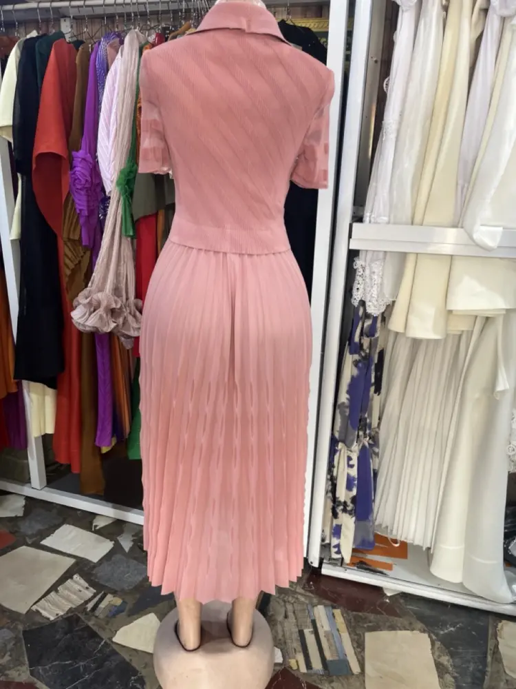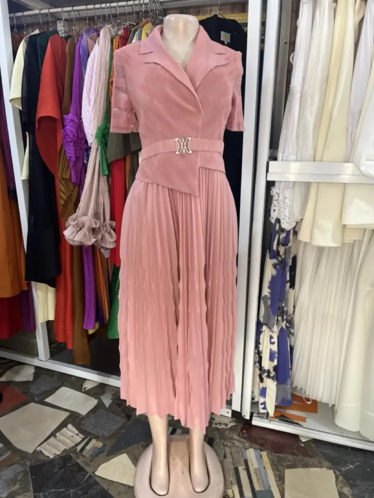 Style: These dresses are characterized by a button-up front, often with a matching belt, and a pleated skirt. Some versions include floral beading or lace details on the collar.