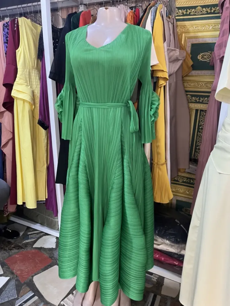 Fabric: It appears to be made from a lightweight, pleated material, often referred to as Miyake-style pleats or satin plissé. This fabric is known for its high elasticity and ability to hold its shape without wrinkling.