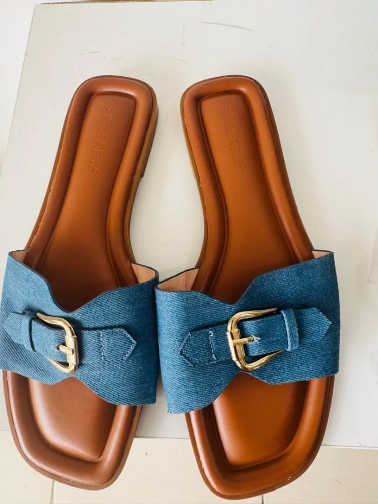 Denim flat-sole slippers featuring a gold-toned buckle strap. Several retailers and brands offer this specific style, notably Primark and DeFacto.