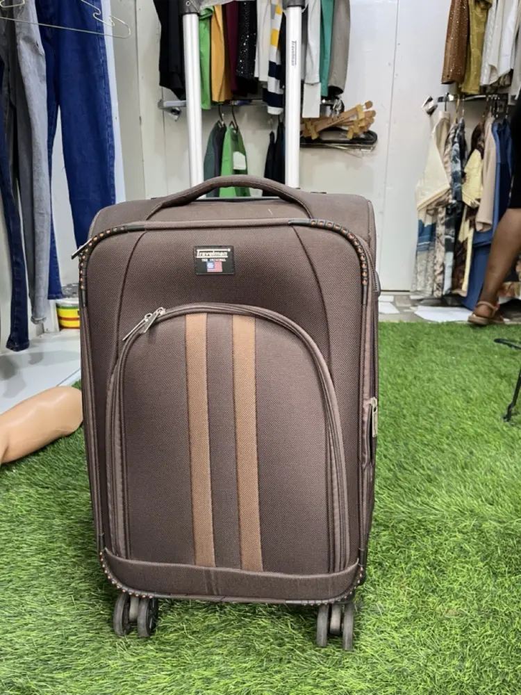 Tags:suitcase, Soft-shell, brown trolley, vertical stripes, front