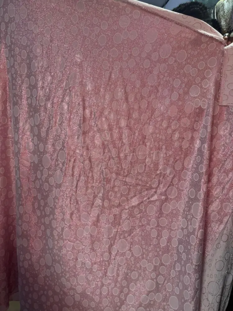 tis is a pink material featuring a textured, multi-sized circle or "bubble" pattern. Based on its appearance and similar items, it is likely a type of crinkle polyester, cotton bambula, or embossed lace used for garments like skirts, dresses, or blouses.