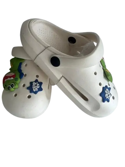 White children's clogs decorated with cartoon shoe charms (often called Jibbitz). While the exact pair with these specific "Super" and dinosaur charms may vary by retailer, similar styles and the individual charms can be found at various stores.