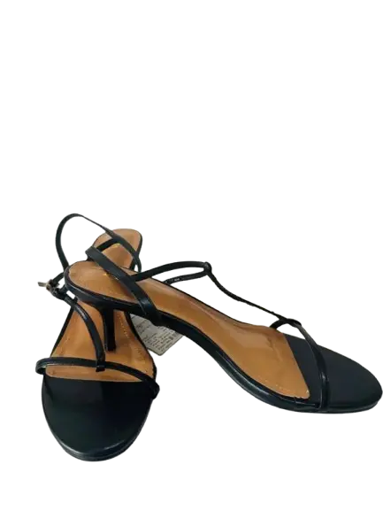 Zara black strappy sandals characterized by a thin kitten heel and a rounded-toe design. These heels feature a distinctive double front strap arrangement with gold-toned metal hardware details on the front strap