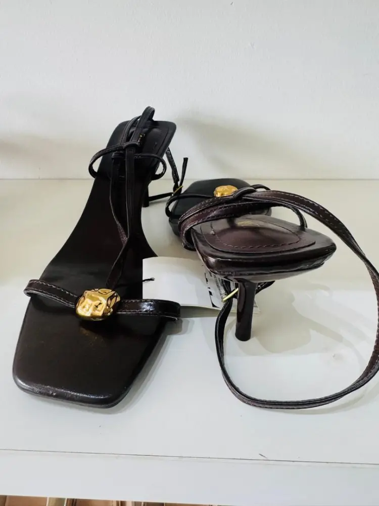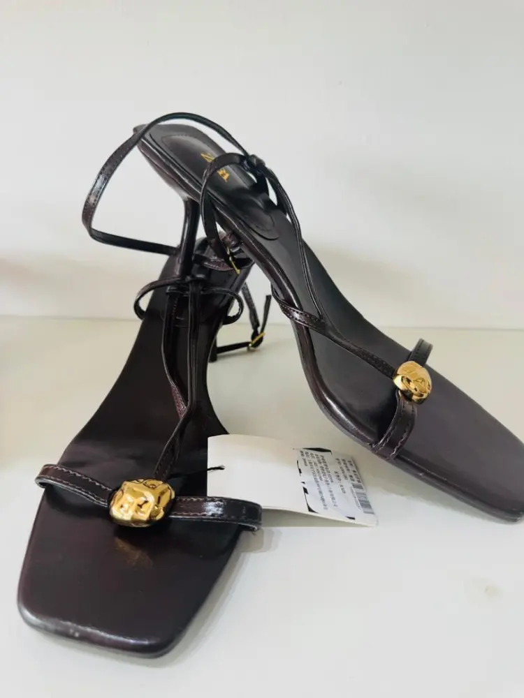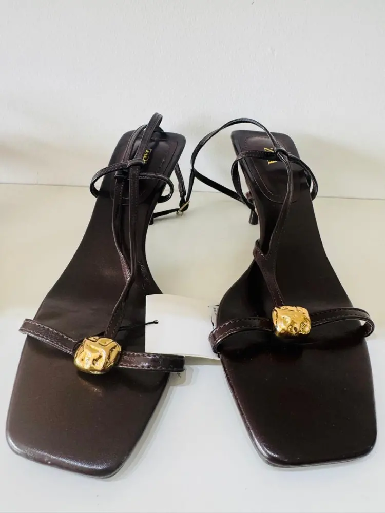 A distinctive gold textured metal buckle embellishment on the T-strap . They are often identified as a Zara style, characterized by a square toe and a thin stiletto heel