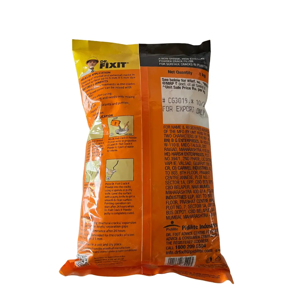 Dr. Fixit 202 crack-x powder, a non-shrink, high-strength, polymer-modified, cement-based powder material for filling surface cracks in plaster. It requires only the addition of water on site to form a paste and is designed for internal and external application.