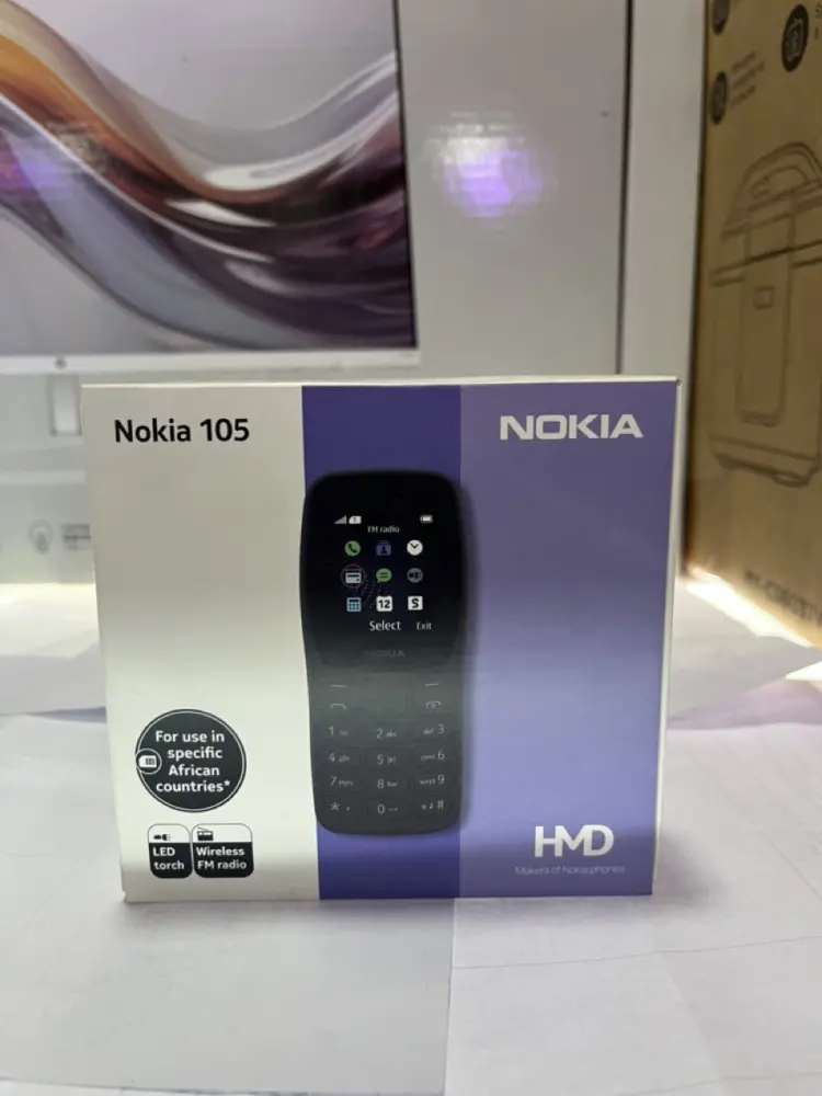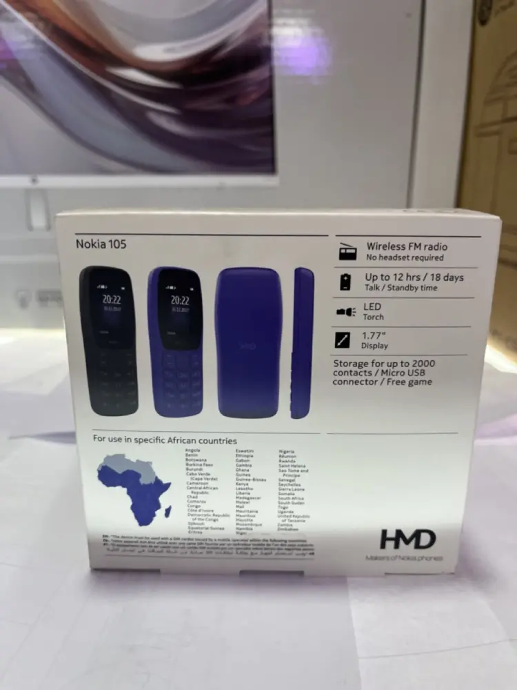 Nokia 105, a basic feature phone designed primarily for essential communication. This specific model is intended for use in "specific African countries" as indicated on the box