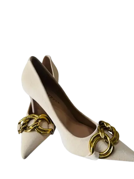 BIGTREE European and American Fashion Banquet High Heels. These elegant shoes feature a pointed-toe design and a prominent gold metal chain buckle accent on the toe.