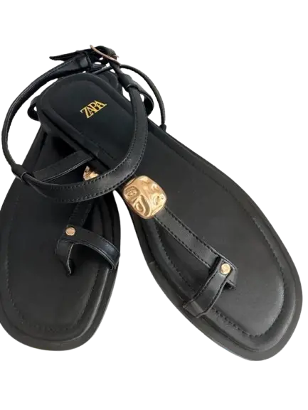 These minimalist black thong sandals feature a signature gold-tone hardware detail and are from ZARA. They are designed with thin, adjustable ankle straps and a flat sole, making them a versatile option for casual summer wear