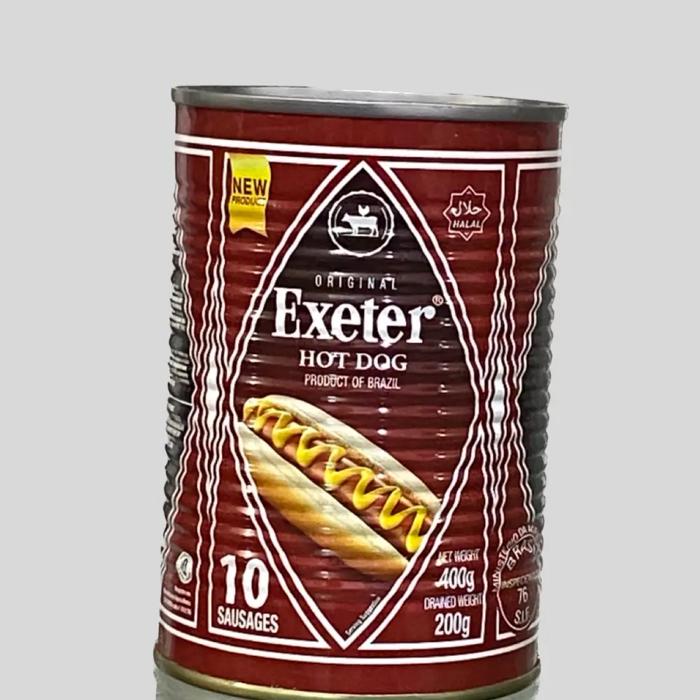 Exeter Chicken Hot Dogs are canned sausages produced in Brazil. They come in an "original" flavor and are sold in tins containing 10 sausages. They are commonly found in the United Kingdom and various African countries, including Ghana and Nigeria.