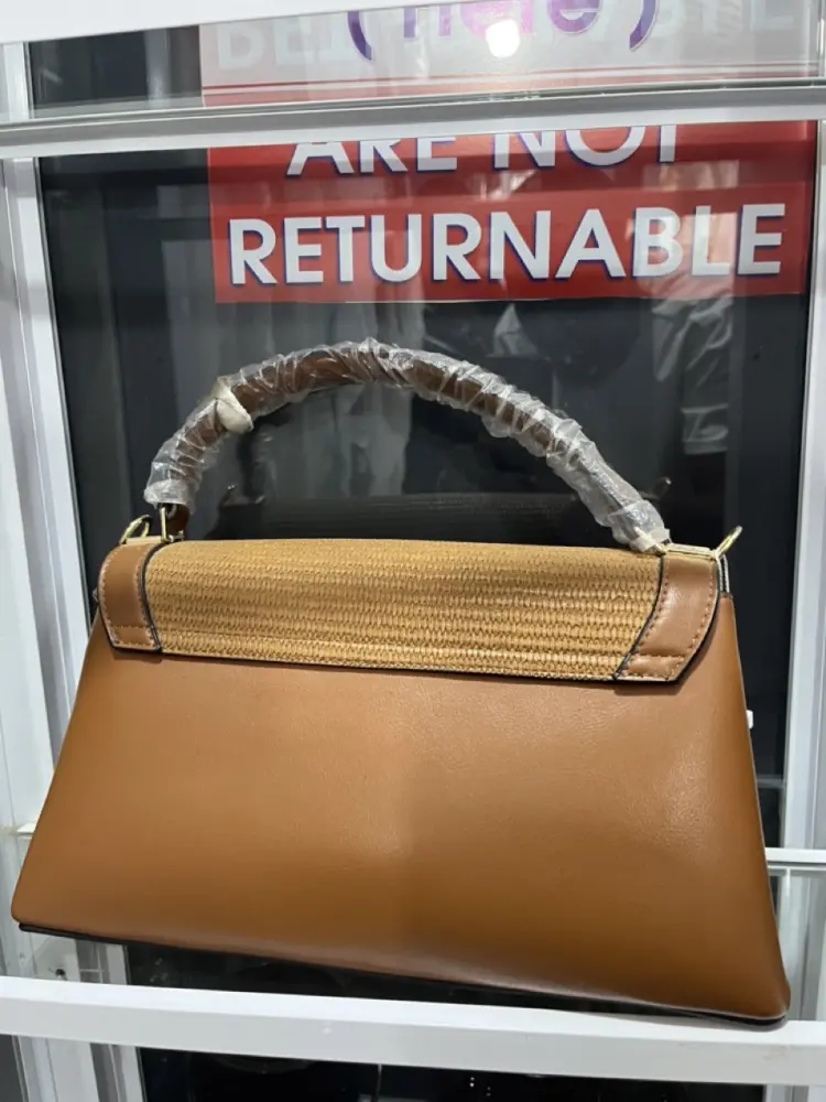 Two-Tone Aesthetic: The bag features a high-contrast design, pairing solid camel/tan leather trim with a beige woven fabric front and back panel.
