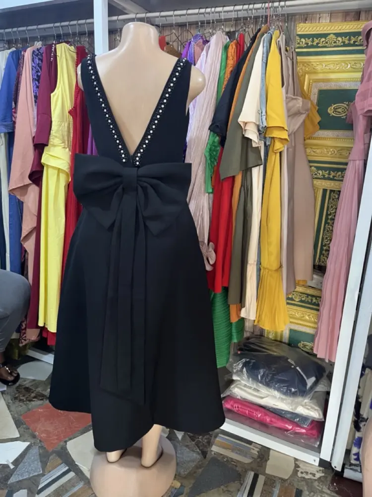 Tags:Black midi dress, V-neckline, both the front and back, prominent oversized bow