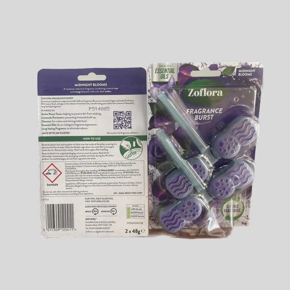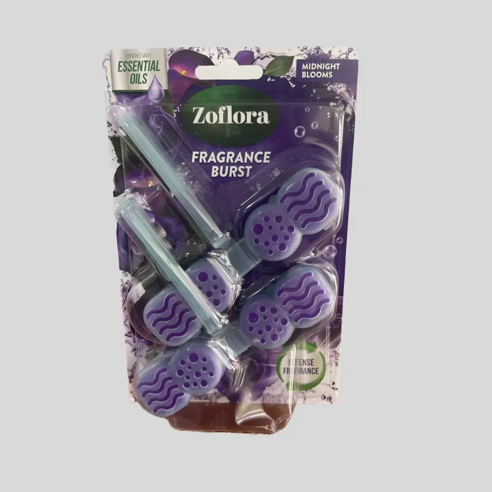 Fragrance: The rim blocks are infused with essential oils to deliver an intense and long-lasting scent. The specific fragrance of the product in the image isn't explicitly named, but Zoflora offers various scents like Midnight Blooms, Sweet Pea, and Blue Lotus & Water Lily.