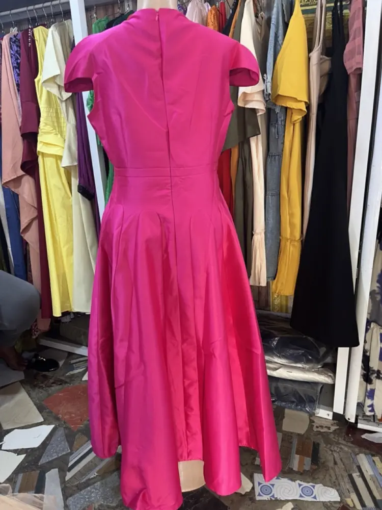 Bodice: Features a V-neckline and short cap sleeves. The tailored bodice typically includes figure-defining seams that transition into sharp, volume-adding pleats at the waist.