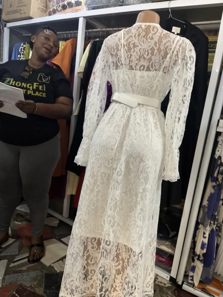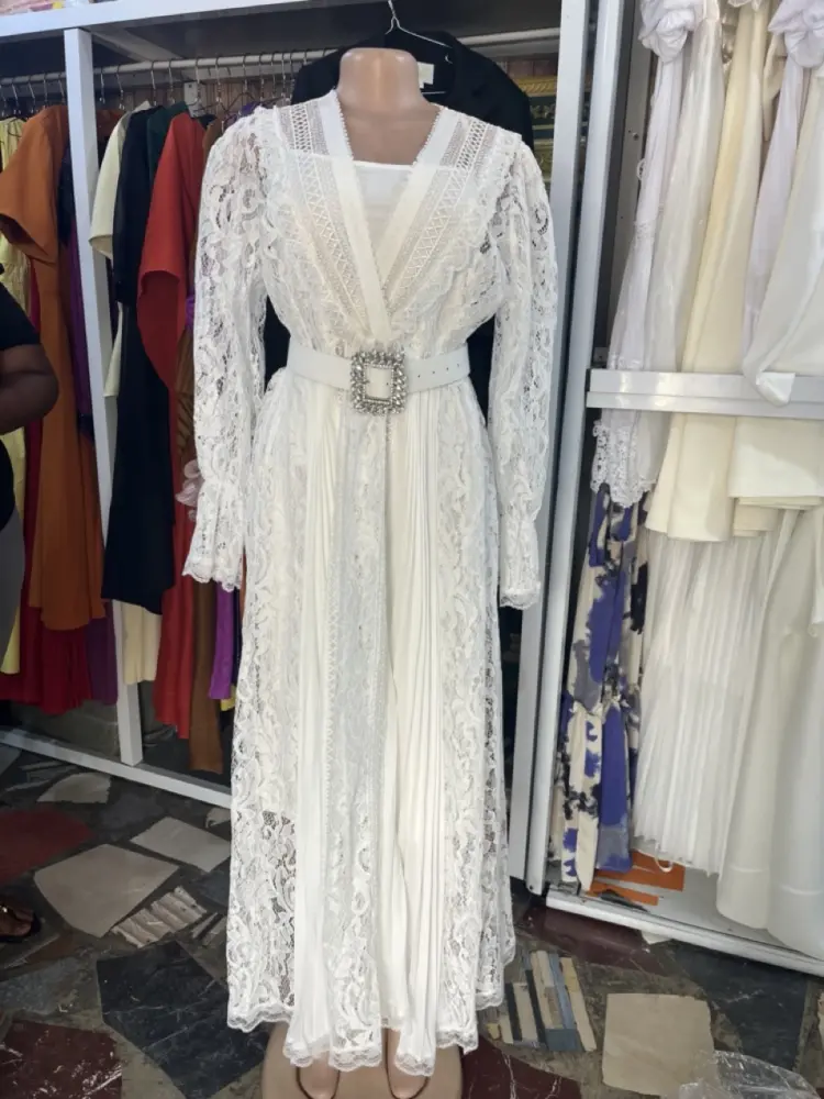 Design: The dress typically includes a V-neckline, hollow-out lace or guipure embroidery, and long sleeves. Some variations feature a crystal buckle belt.