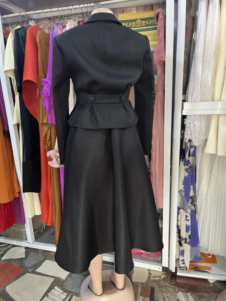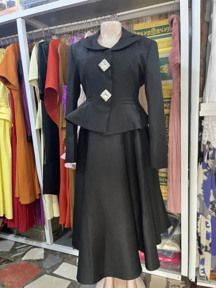 Coordinated Long Skirt: The matching floor-length or maxi skirt is typically flared (A-line) or straight, providing a sleek, modern, and modest look.