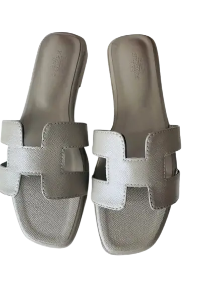 Hermès Oran Sandal, a signature flat silhouette known for its iconic "H" cut-out strap. Based on the light, neutral tone, the color appears to be Beige Mastic or a similar grey-beige shade like Gris Etain or Etoupe