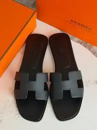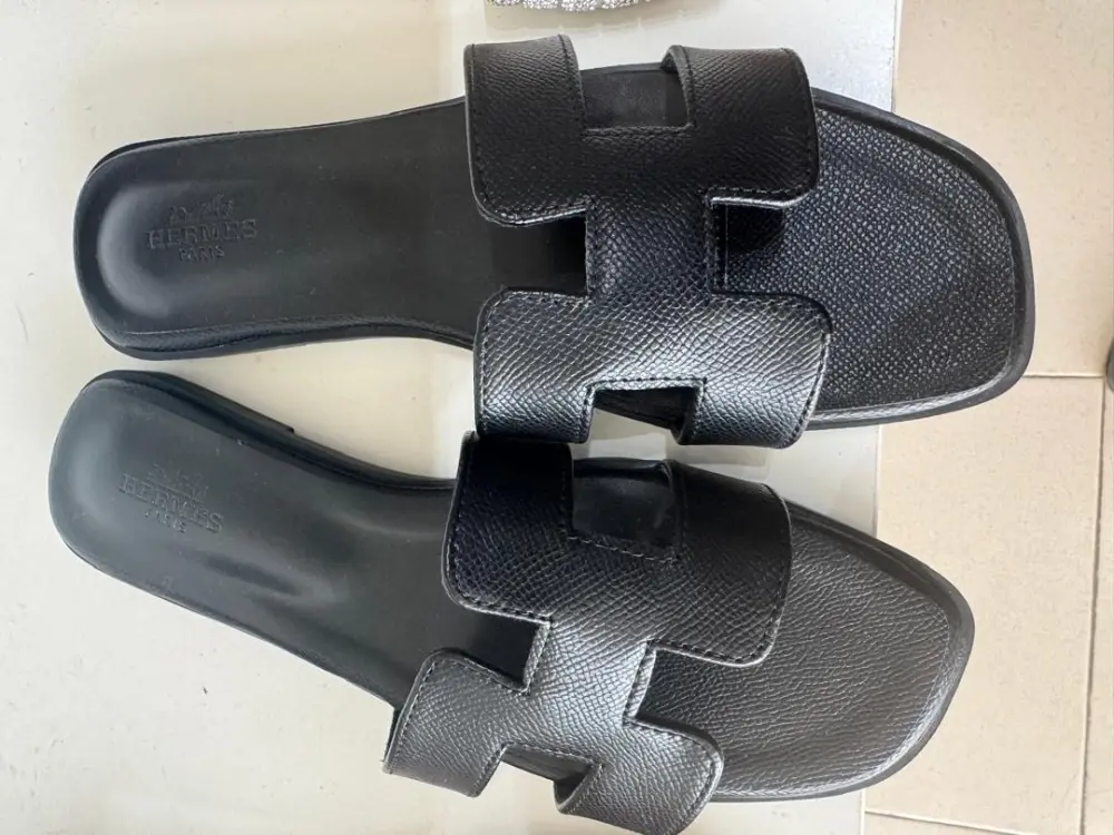 iconic Hermès Oran sandals in black leather. Known for their minimalist sophistication, these flat sandals feature a distinctive "H" cut-out strap, which is a signature element of the Hermès brand