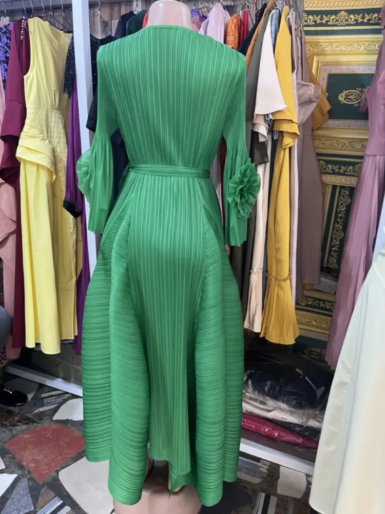 Color: The shade is a vibrant emerald or forest green, which has a subtle sheen due to the way light hits the micro-pleats