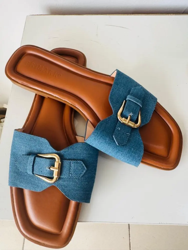 Denim flat-sole slippers featuring a gold-toned buckle strap. Several retailers and brands offer this specific style, notably Primark and DeFacto.
