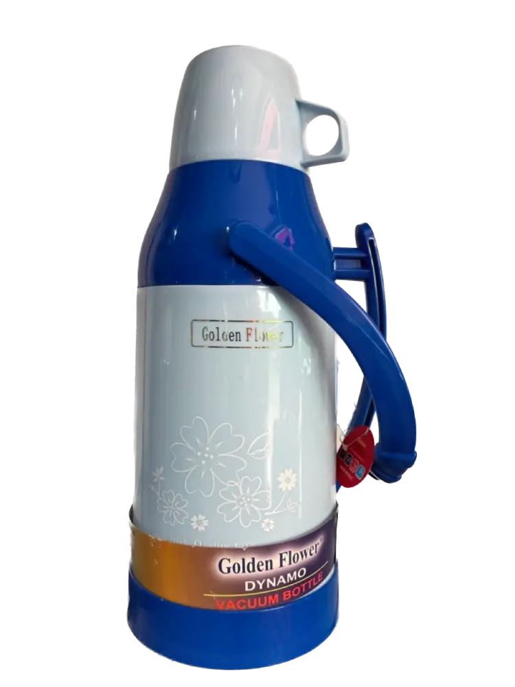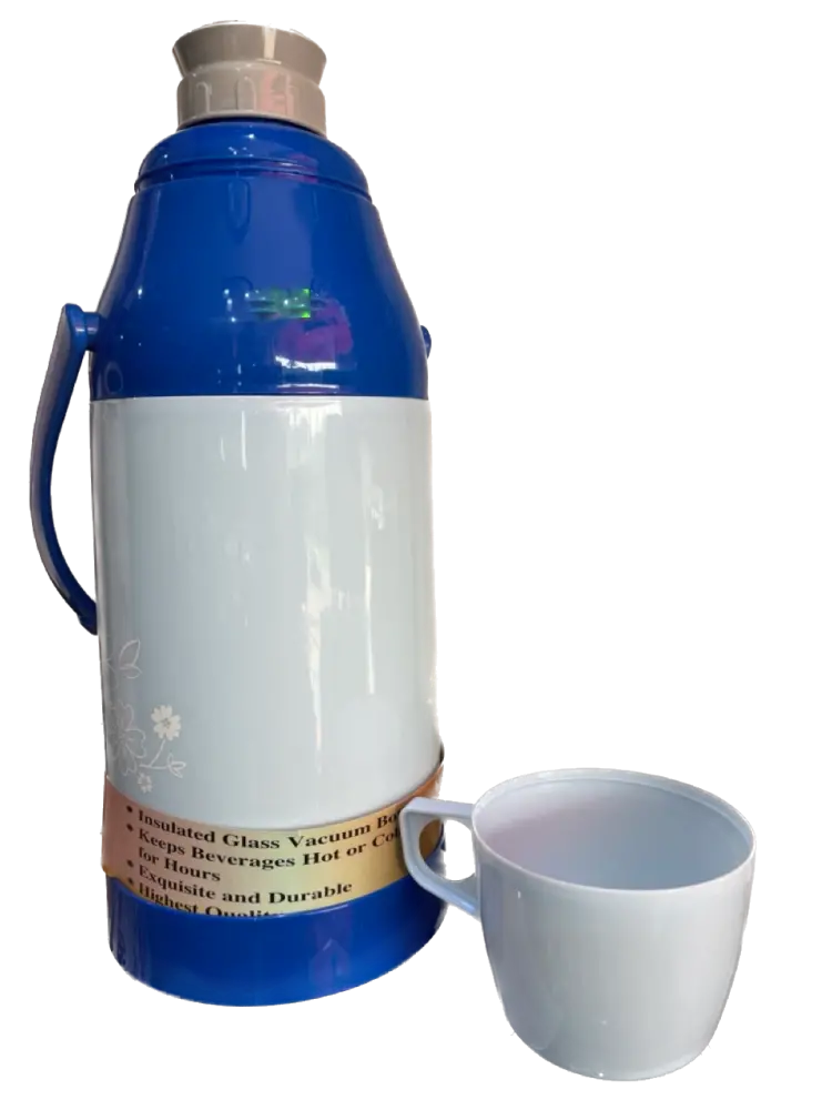 The image displays a, which is designed to keep beverages hot or cold for several hours using a glass vacuum inner liner.