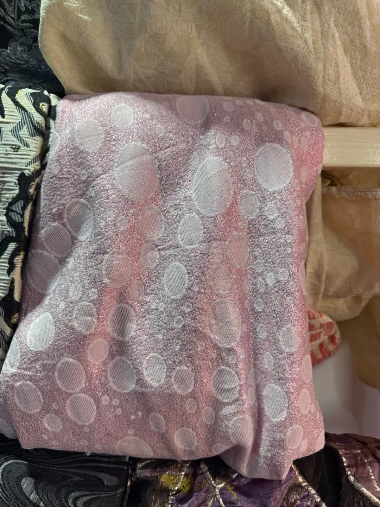 tis is a pink material featuring a textured, multi-sized circle or "bubble" pattern. Based on its appearance and similar items, it is likely a type of crinkle polyester, cotton bambula, or embossed lace used for garments like skirts, dresses, or blouses.