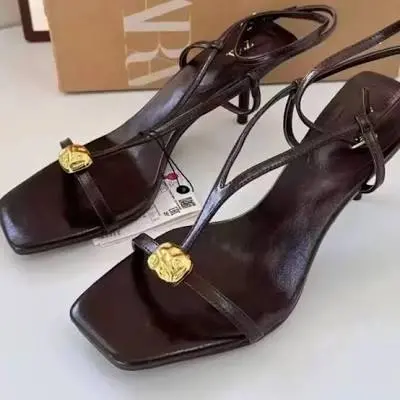 A distinctive gold textured metal buckle embellishment on the T-strap . They are often identified as a Zara style, characterized by a square toe and a thin stiletto heel
