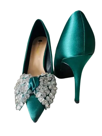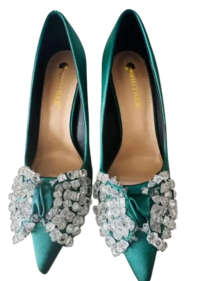 BIGTREE Korean Fashion banquet high-heel shoes. They feature a pointed toe and a prominent rhinestone-encrusted bow knot on the front.