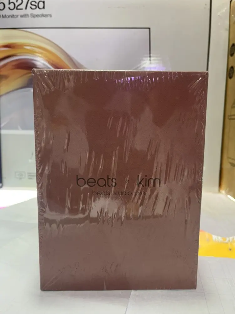 Beats Studio Pro series. This specific colorway and box design are highly consistent with the Beats Studio Pro x Kim Kardashian collaboration, specifically in the Sandstone or a similar neutral "earth tone" finish.