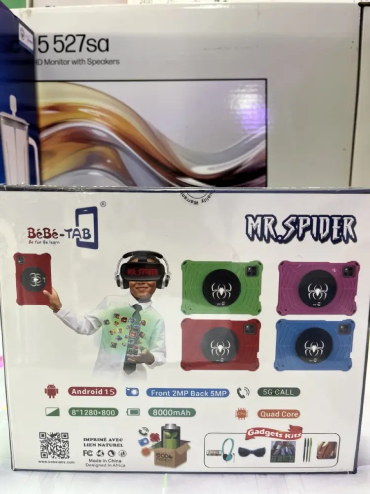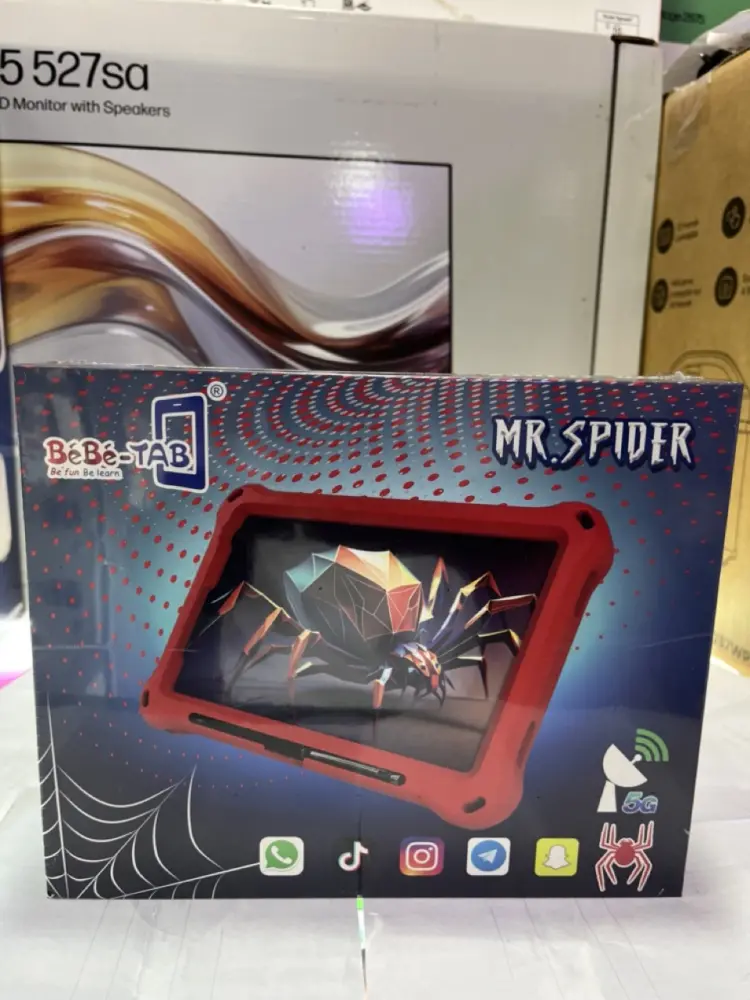 Bebe-Tab B88 Spider, an 8-inch educational tablet designed for children. This device features a durable, shock-proof case with a spider-web motif and is available in multiple colors including red, green, blue, and purple.